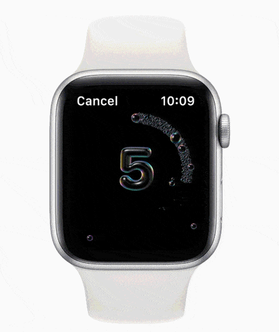 Washing hands properly for at least 20 seconds can help prevent the spread of illness. In a first-of-its-kind innovation for a wearable, Apple Watch uses the motion sensors, microphone, and on-device machine learning to automatically detect handwashing motions and sounds. It then initiates a 20-second countdown timer, and if the user finishes early, they will be prompted to keep washing. Apple Watch can also conveniently remind the user to wash their hands when they return home.