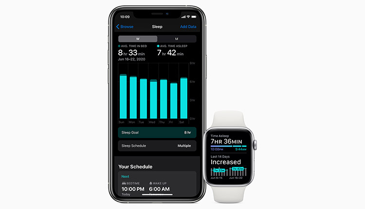 With watchOS 7, Apple Watch introduces sleep tracking, taking a holistic approach to sleep by providing valuable tools to help users get the desired amount of sleep, get to bed on time, and create a pre-bedtime routine to meet their sleep goals. Through the detection of micro-movements from the watch’s accelerometer, which signals respiration during sleep, Apple Watch intelligently captures when the wearer is sleeping and how much sleep they get each night. In the morning, the wearer will see a visualization of their previous night’s sleep, including periods of wake and sleep. They will also see a chart showing their weekly sleep trend.