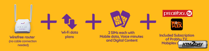 The main feature of WireFree Plus WiFi service is the attractive bundling of various services. Under the bundling service, customers will be offered 2 SIM cards with 5 GB data in each SIM and 425 minutes talk time per month along with rich mobile content within the Ncell network such as music in Hungama App, Daami music, Prabhu TV and MobiPlex.